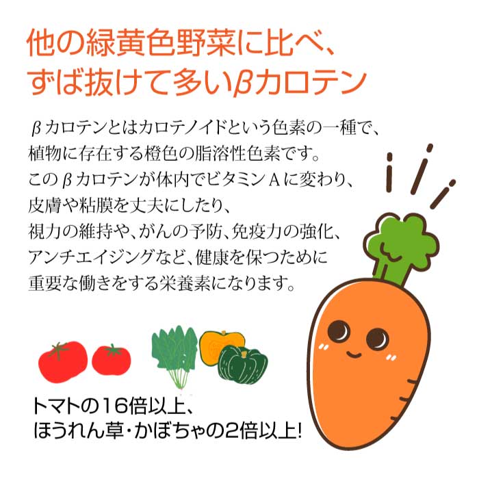 他の緑黄色野菜に比べ、ずば抜けて多いβカロテンβカロテンとはカロテノイドという色素の一種で、植物に存在する橙色の脂溶性色素です。 このβカロテンが体内でビタミンAに変わり、皮膚や粘膜を丈夫にしたり、視力の維持や、がんの予防、免疫力の強化、アンチエイジングなど、健康を保つために重要な働きをする栄養素になります。 トマトの16倍以上、ほうれん草・かぼちゃの2倍以上!