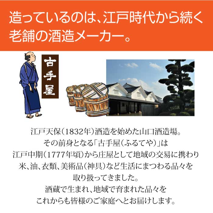 造っているのは、江戸時代から続く老舗の酒造メーカー。江戸天保(1832年)酒造を始めた山口酒造場。 その前身となる「古手屋(ふるてや)」は江戸中期(1777年頃)から庄屋として地域の交易に携わり米、油、衣類、美術品(神具)など生活にまつわる品々を取り扱ってきました。 酒蔵で生まれ、地域で育まれた品々をこれからも皆様のご家庭へとお届けします。
