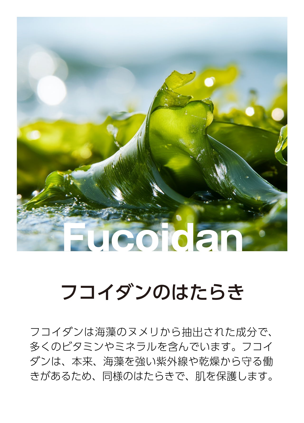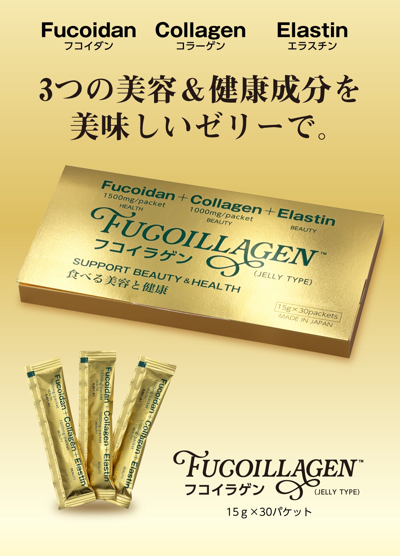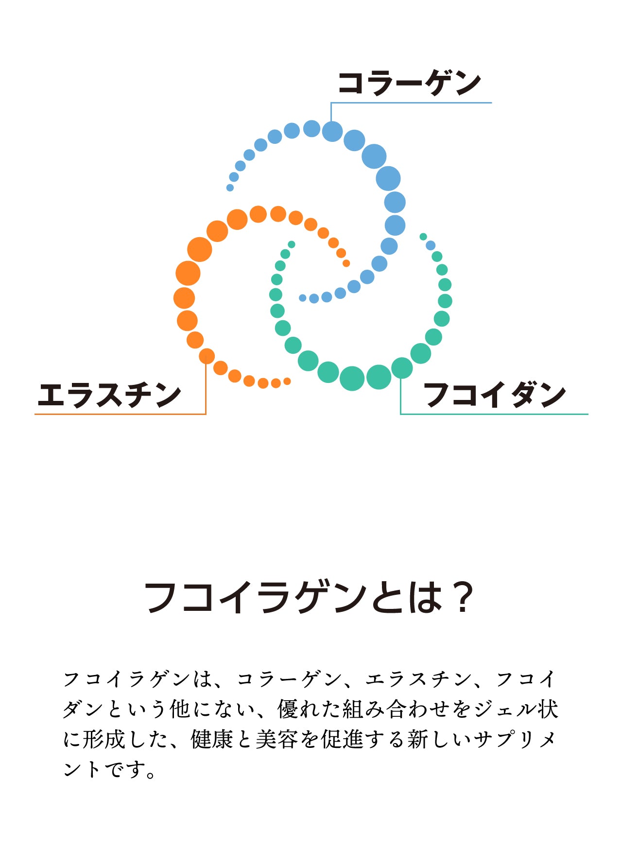 - フコイダン抽出液(国内製造)、フィッシュコラーゲン、ザクロ果汁、エリスリトール、寒天、エラスチンペプチド(魚由来)/香料、ゲル化剤(増粘多糖類)、酸味料、甘味料(ステビア)、(一部にゼラチンを含む)