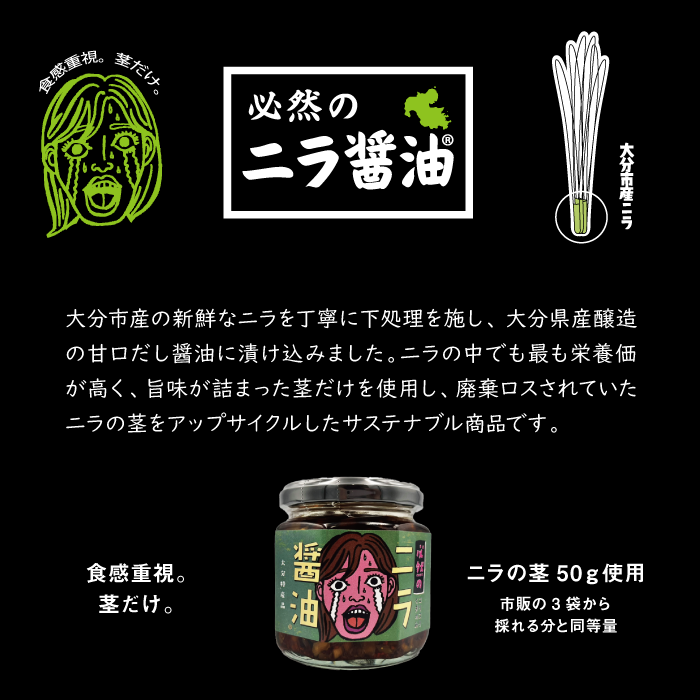 \食感重視。茎だけ/ 必然のニラ醤油大分市産の新鮮なニラを丁寧に下処理を施し、大分県産醸造の甘口だし醤油に漬け込みました。ニラの中でも最も栄養価が高く、旨味が詰まった茎だけを使用し、廃棄ロスされていたニラの茎をアップサイクルしたサステナブル商品です。 【食感重視。茎だけ。】【ニラの茎 50g使用】【ニラと醤油が渾然一体。】【元気が欲しい時に。】